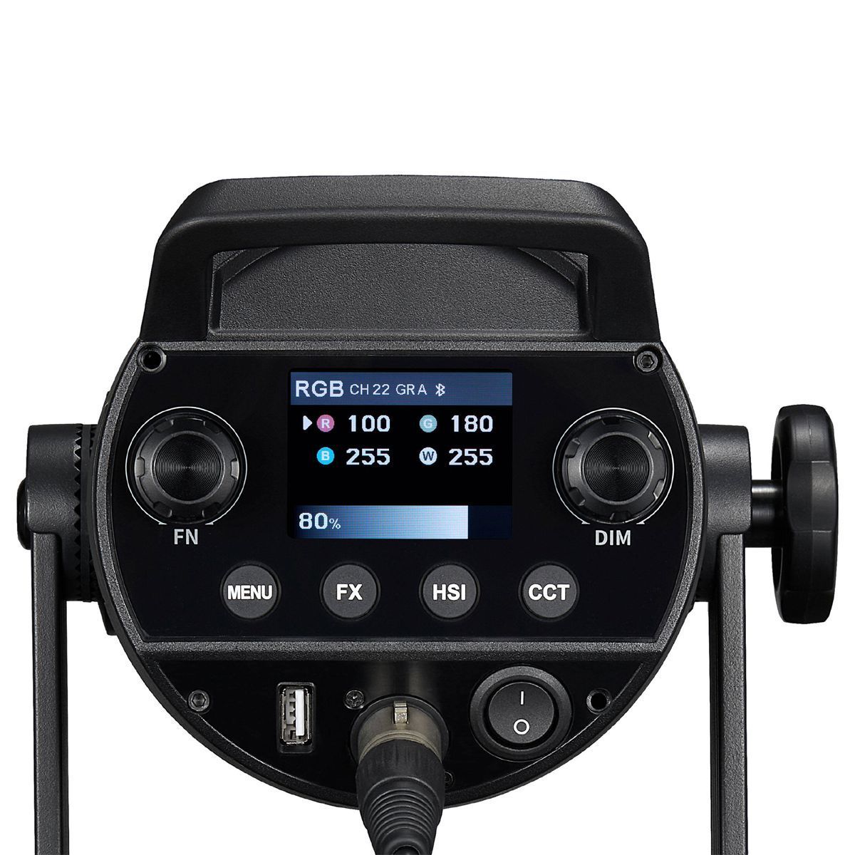 RGB-осветитель, мощность 330 Вт, регулируемая цветовая температура 2800-6500K, CRI/TLCI ≥96/97, освещенность до 48100 лк, 14 спецэффектов, возможность дистанционного управления с пульта, по каналу DMX или со смартфона через мобильное приложение, бесшумный режим работы, угол раскрытия светового луча 20°… 65°, стандартный рефлектор, кейс для хранения.